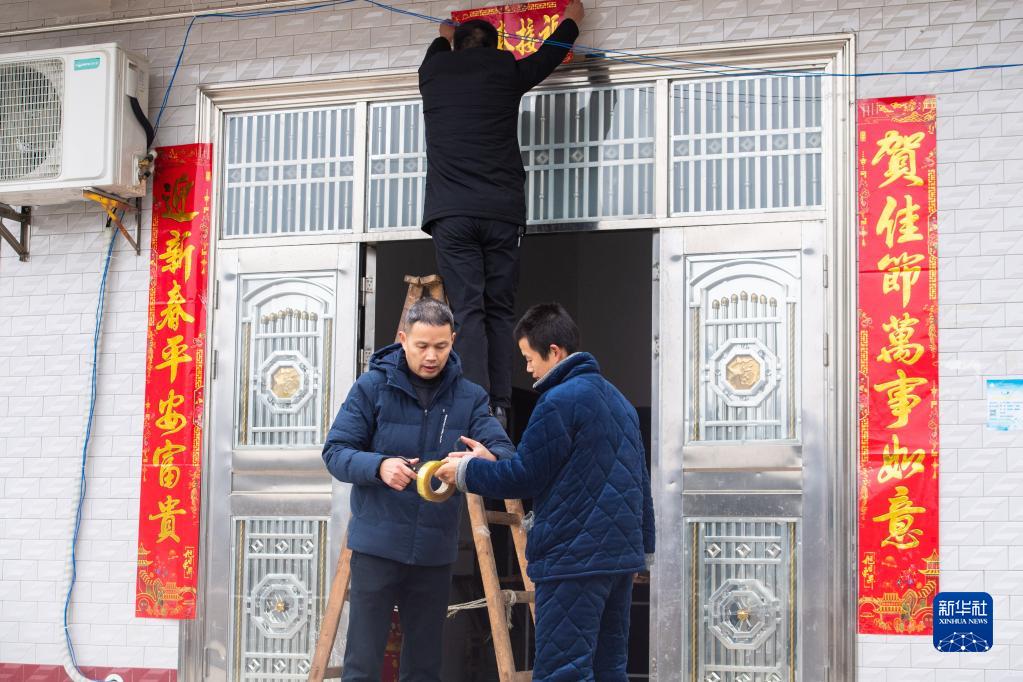 1月15日,在漢壽縣豐家鋪鎮筆架村,鄉村振興駐村工作隊成員和脫貧戶(hù)(右一)一起貼春聯(lián)。