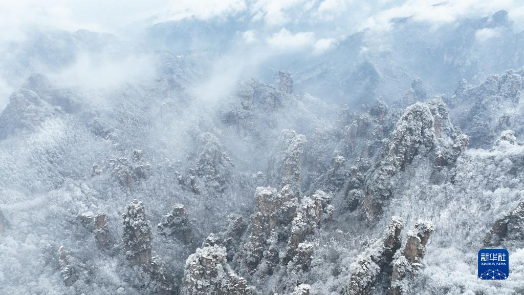 當日,位于湖南張家界的天子山被冰雪覆蓋,峰林銀裝素裹,美如畫(huà)卷。