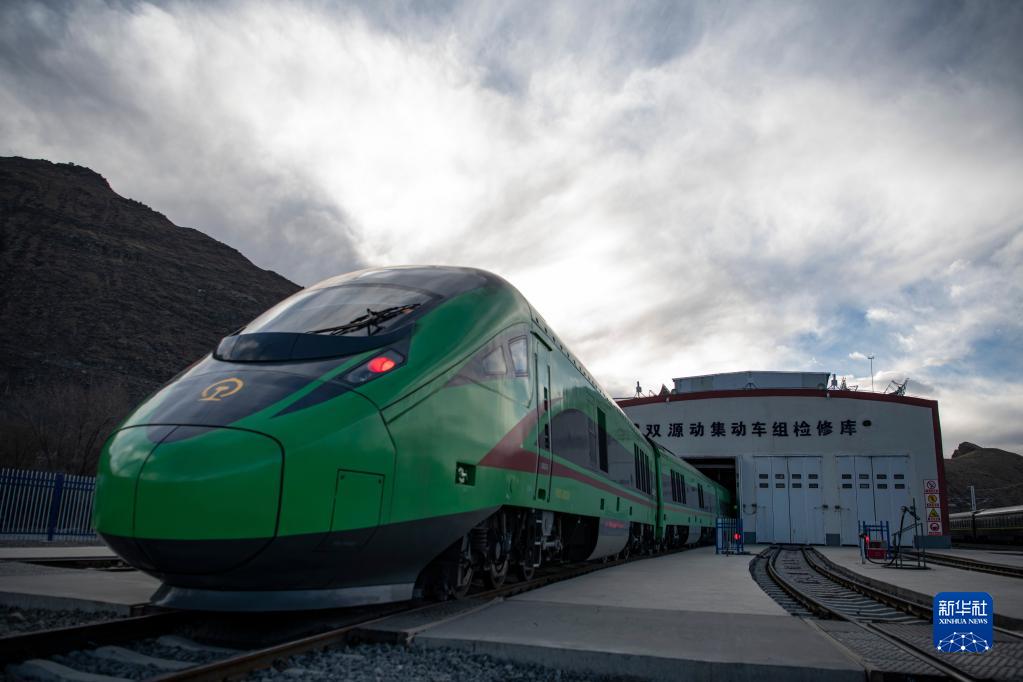 在拉薩機輛整備中心,動(dòng)車(chē)組在檢修庫進(jìn)行整備作業(yè)(1月10日攝)。