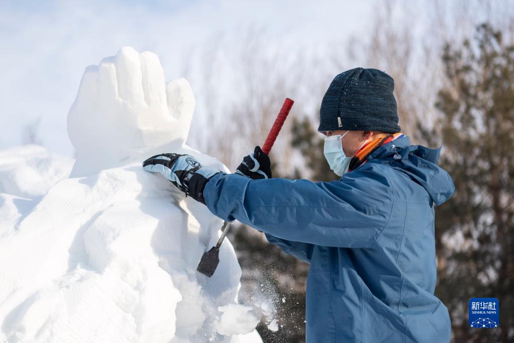 1月16日,在哈爾濱太陽(yáng)島雪博會(huì )園區,參賽選手在進(jìn)行雪雕創(chuàng )作。
