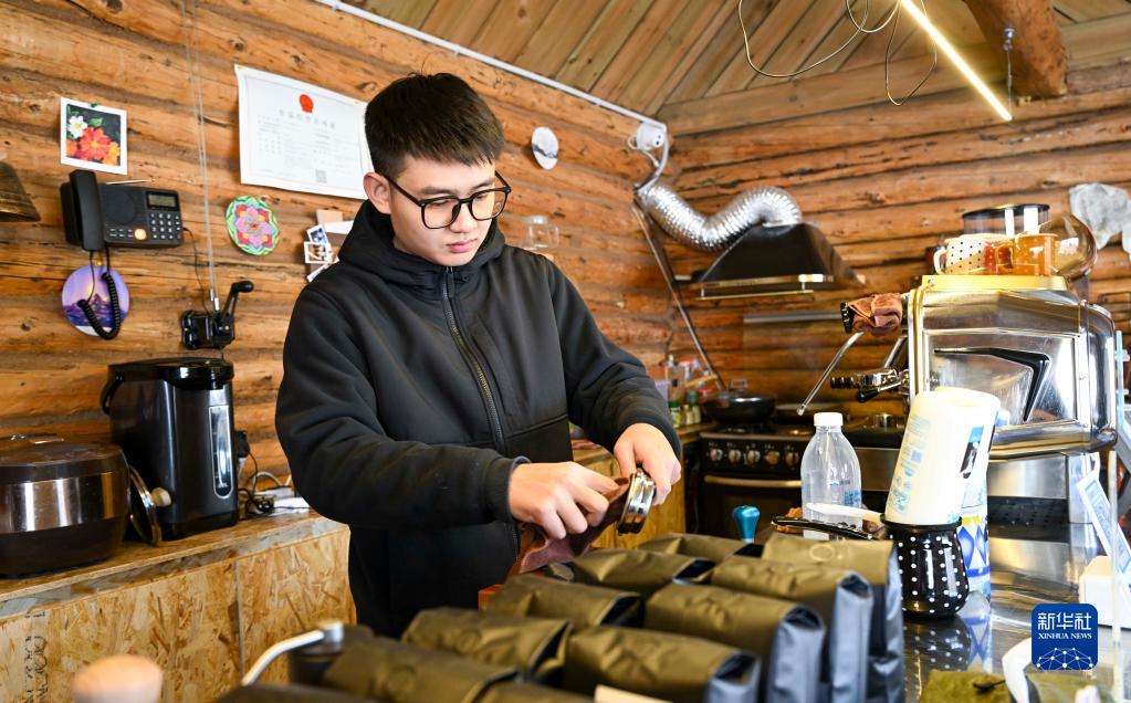 在新疆阿勒泰地區禾木村的一家咖啡店,來(lái)自天津的店長(cháng)李沛安為顧客制作咖啡(1月13日攝)。