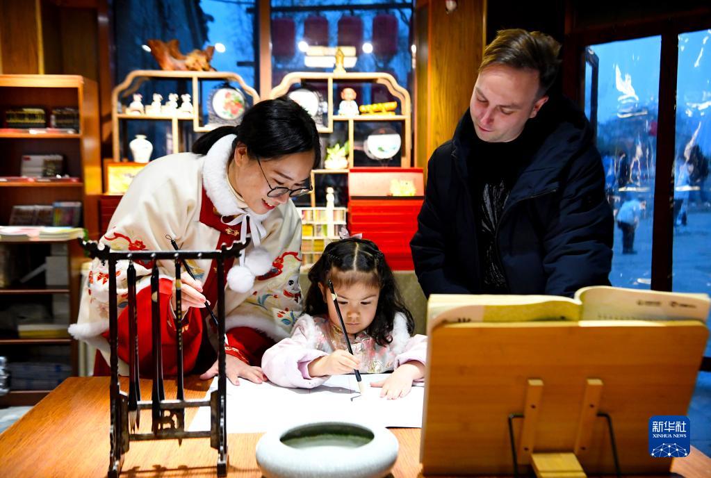 1月13日,在洛陽(yáng)市洛邑古城一家文創(chuàng )店內,喬丹與妻子范夢(mèng)佳教女兒艾潤寫(xiě)毛筆字。