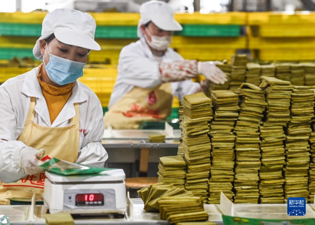 1月16日,陜西延安甘泉縣一家食品公司的工人在車(chē)間對原味豆干進(jìn)行稱(chēng)重包裝。