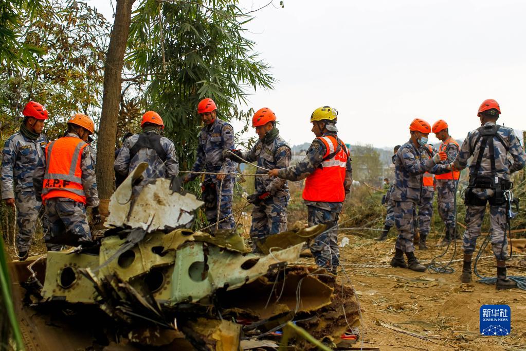 1月16日,救援人員在尼泊爾博克拉地區墜機現場(chǎng)工作。