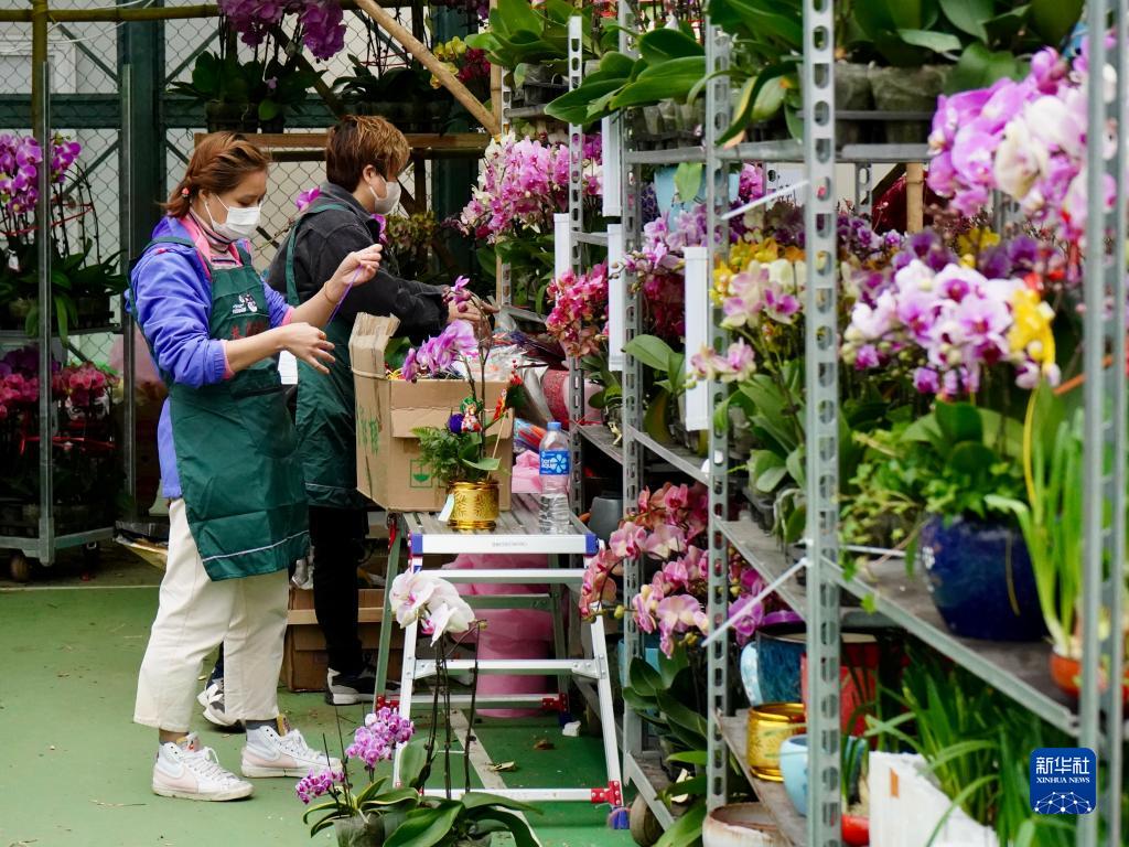 1月16日,在維多利亞公園年宵花市,攤主在布置花攤。新華社記者 褚萌萌 攝