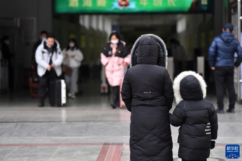 1月16日,在蘭州火車(chē)站西出站口,一位女士帶著(zhù)孩子翹首以盼丈夫出站。