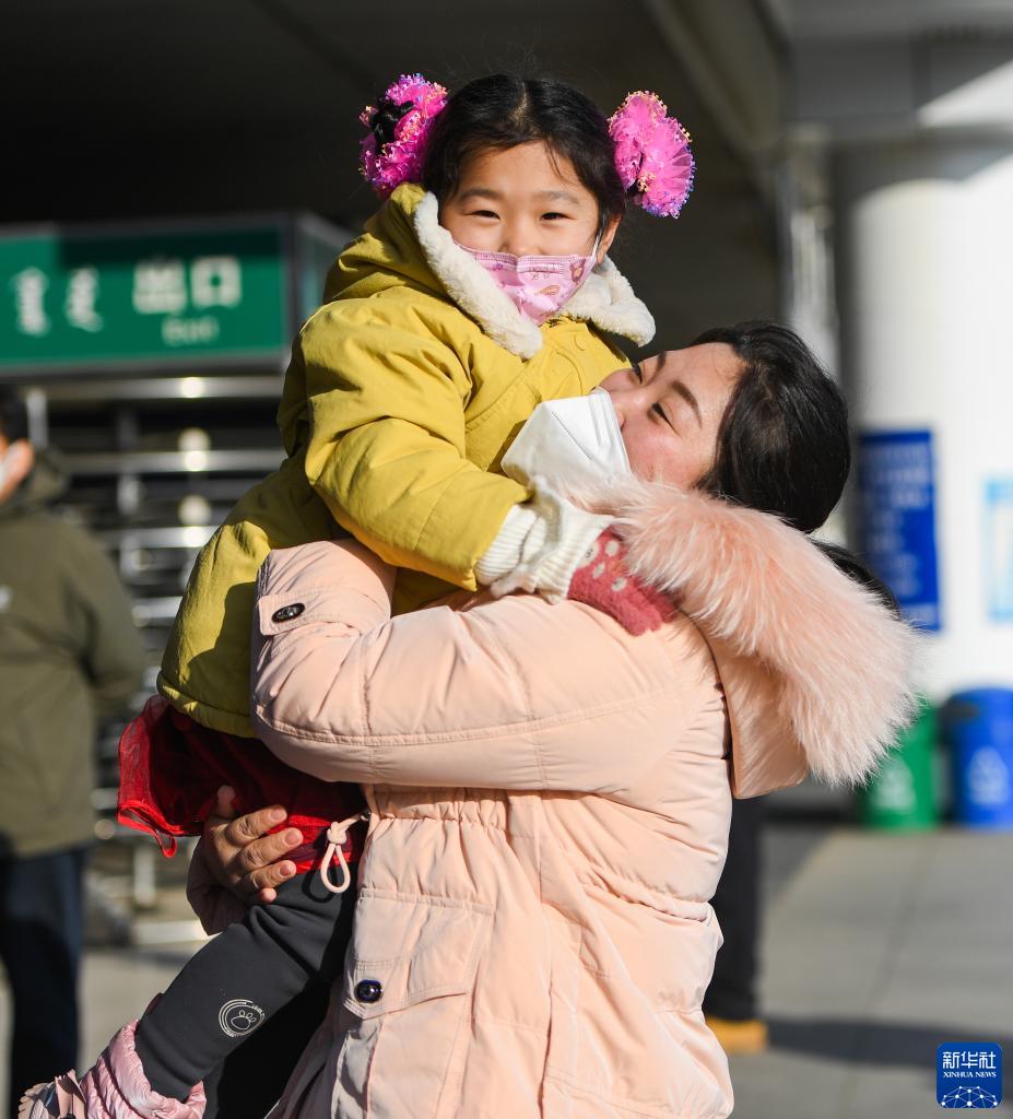 1月15日,在呼和浩特東站,母親抱起剛出站的女兒。新華社記者 劉磊 攝