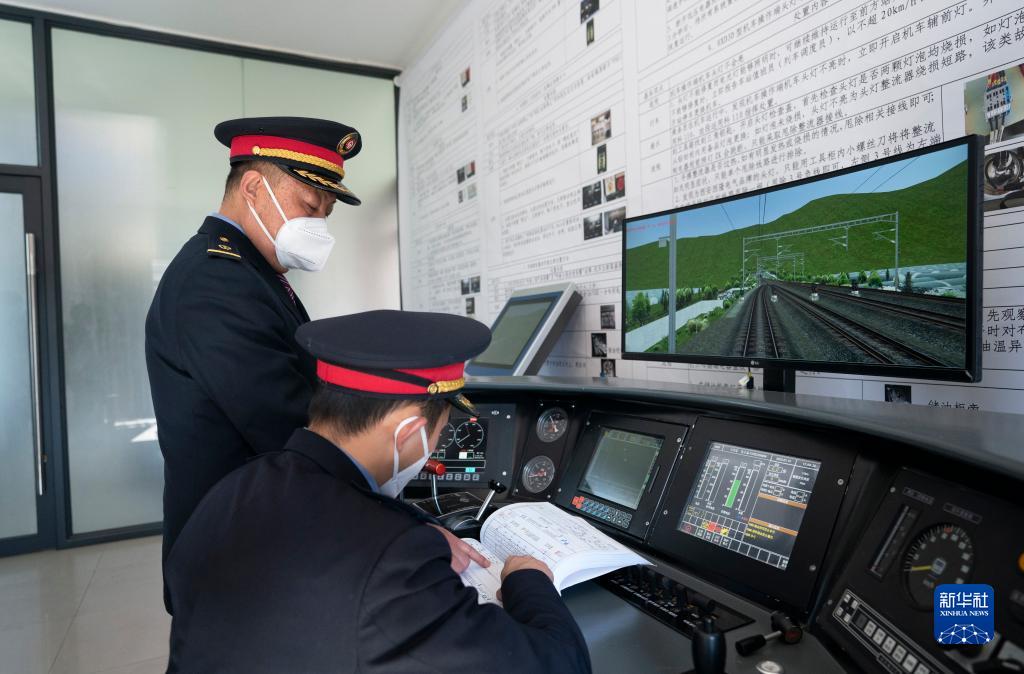 1月15日,丁建華(左)在火車(chē)模擬駕駛設備前為徒弟姜庭瑞進(jìn)行講解。