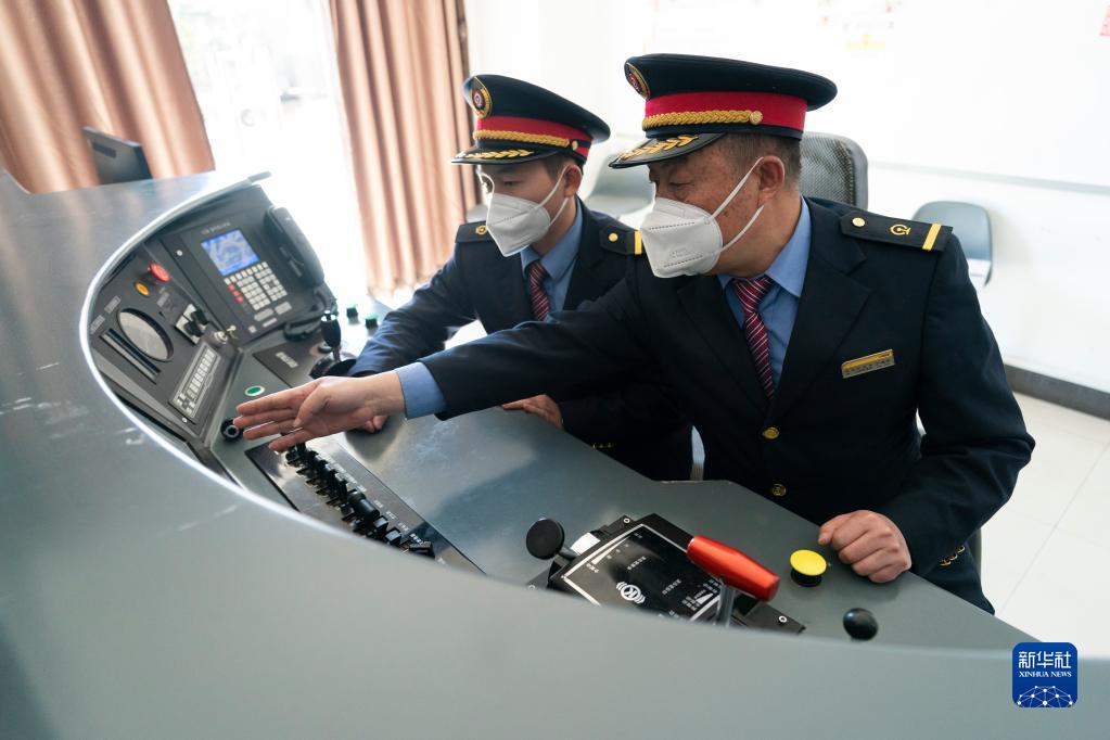 1月15日,丁建華(右)在火車(chē)模擬駕駛設備前為徒弟姜庭瑞進(jìn)行講解。