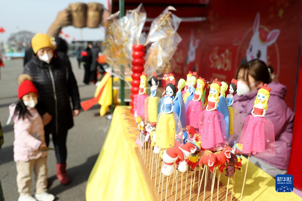 1月17日,市民帶著(zhù)孩子在山東省青島西海岸新區一處集市選購泥人面塑。