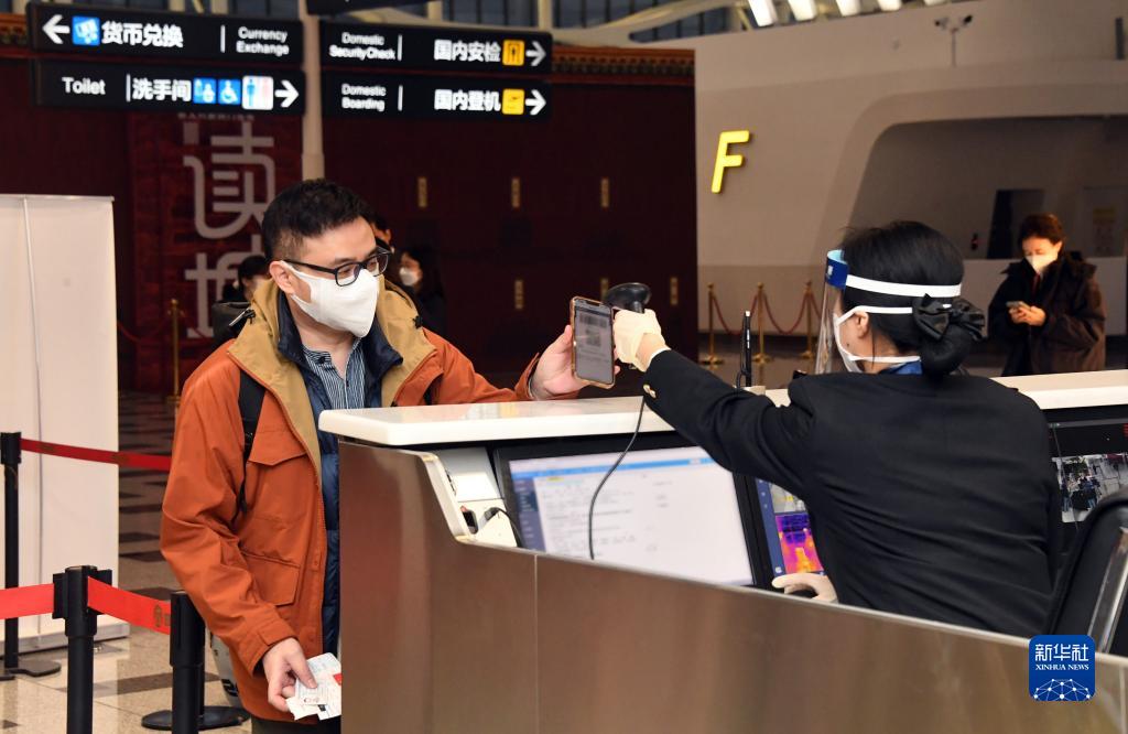 1月17日,在北京大興機場(chǎng),海關(guān)關(guān)員核驗乘坐CZ309次北京飛往香港航班旅客的海關(guān)健康申報二維碼。
