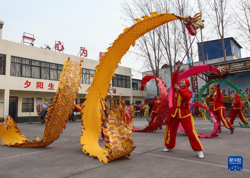 1月16日,在河南省焦作市博愛(ài)縣鴻昌街道九街社區,博愛(ài)空竹舞龍藝術(shù)團的隊員們在表演。