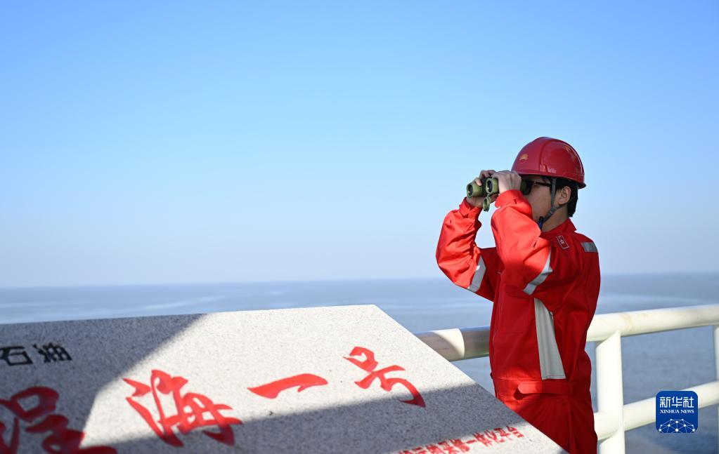 埕海一號海上采油平臺瞭望員在對海面浮冰進(jìn)行瞭望(1月16日攝)。