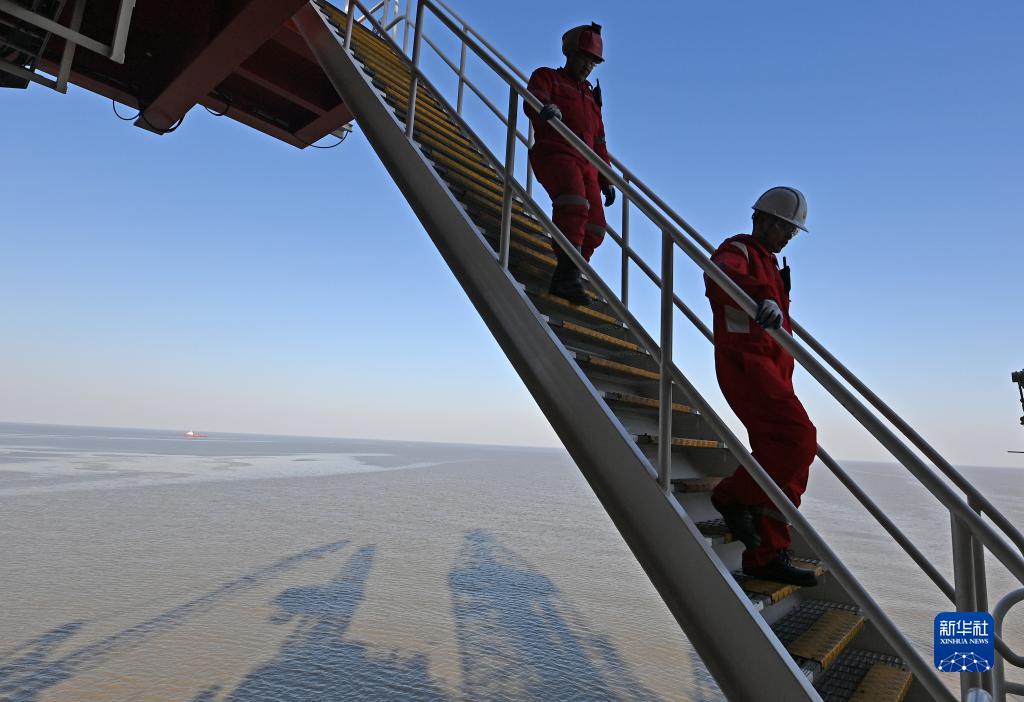 埕海一號海上采油平臺工作人員行走在平臺懸空樓梯上(1月16日攝)。
