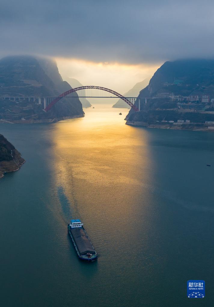 1月18日,船舶行駛在長(cháng)江三峽湖北省宜昌市秭歸縣水域(無(wú)人機照片)。