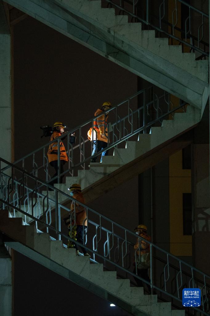 1月17日夜,鐵路工人沿著(zhù)檢修通道攀登上杭臺高鐵椒江特大橋橋面。