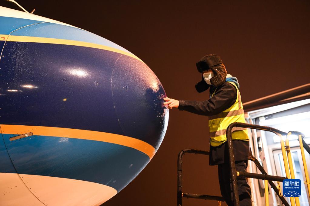 1月17日晚,在貴陽(yáng)龍洞堡國際機場(chǎng),南方航空的機務(wù)人員對飛機除冰情況進(jìn)行檢查。