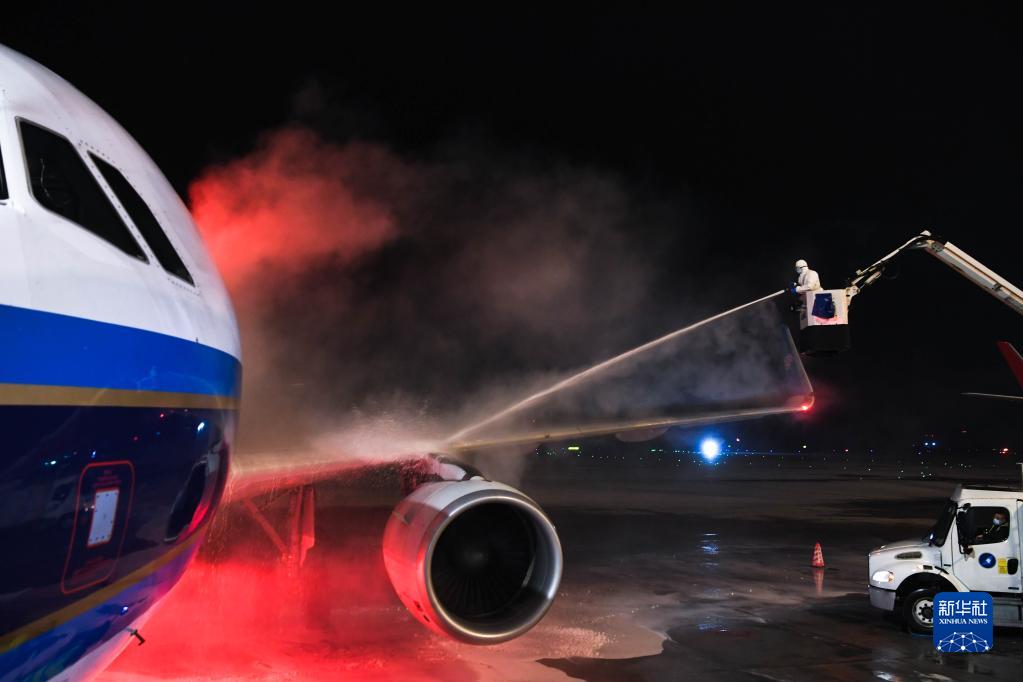 1月17日晚,在貴陽(yáng)龍洞堡國際機場(chǎng),南方航空的機務(wù)人員進(jìn)行除防冰作業(yè)。