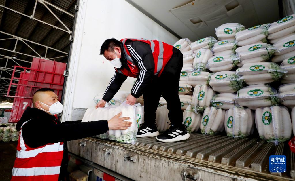 1月17日,在上海江橋蔬菜批發(fā)市場(chǎng)內,批發(fā)商王加中(右)將來(lái)自重慶的白蘿卜卸下貨車(chē)。