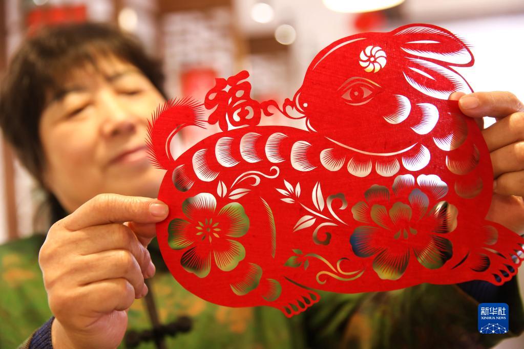 1月18日,在承德市雙橋區俊鳳剪紙創(chuàng )作室,剪紙藝人石俊鳳展示賀歲迎春生肖兔主題剪紙作品。