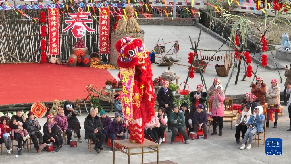 1月17日,村民在“村晚”活動(dòng)中觀(guān)看舞獅表演(無(wú)人機照片)。