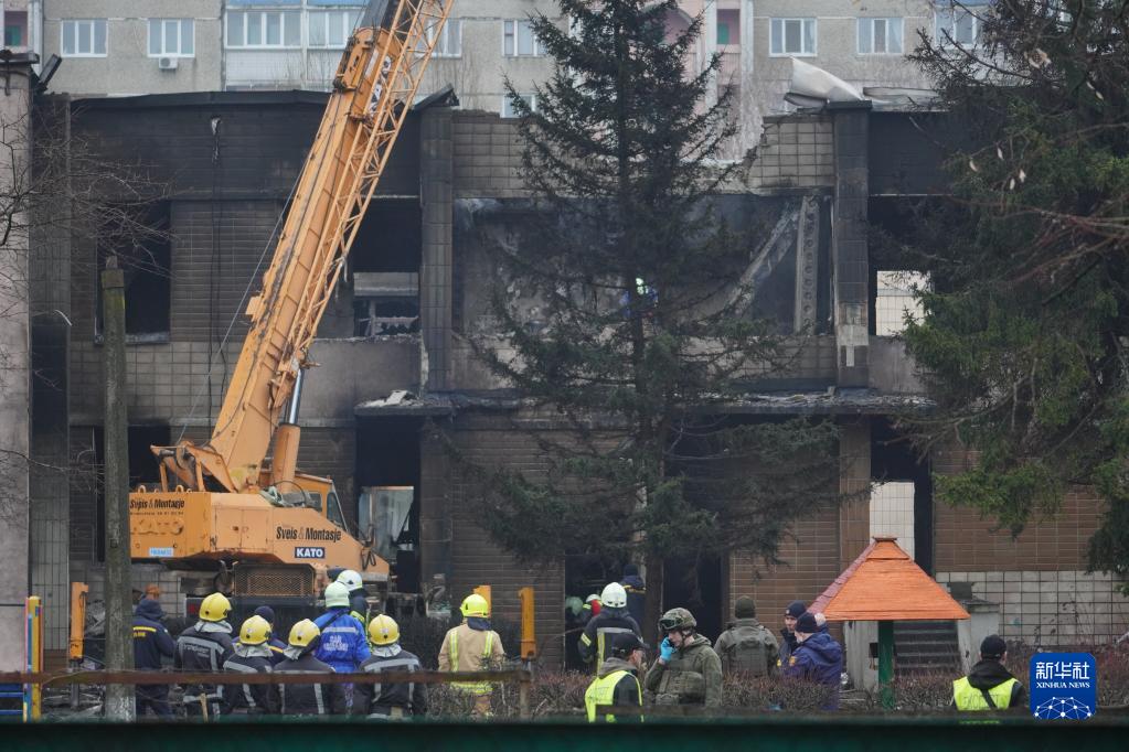 1月18日,烏克蘭國家緊急情況局工作人員在烏克蘭基輔市東郊布羅瓦雷的直升機墜機現場(chǎng)工作。