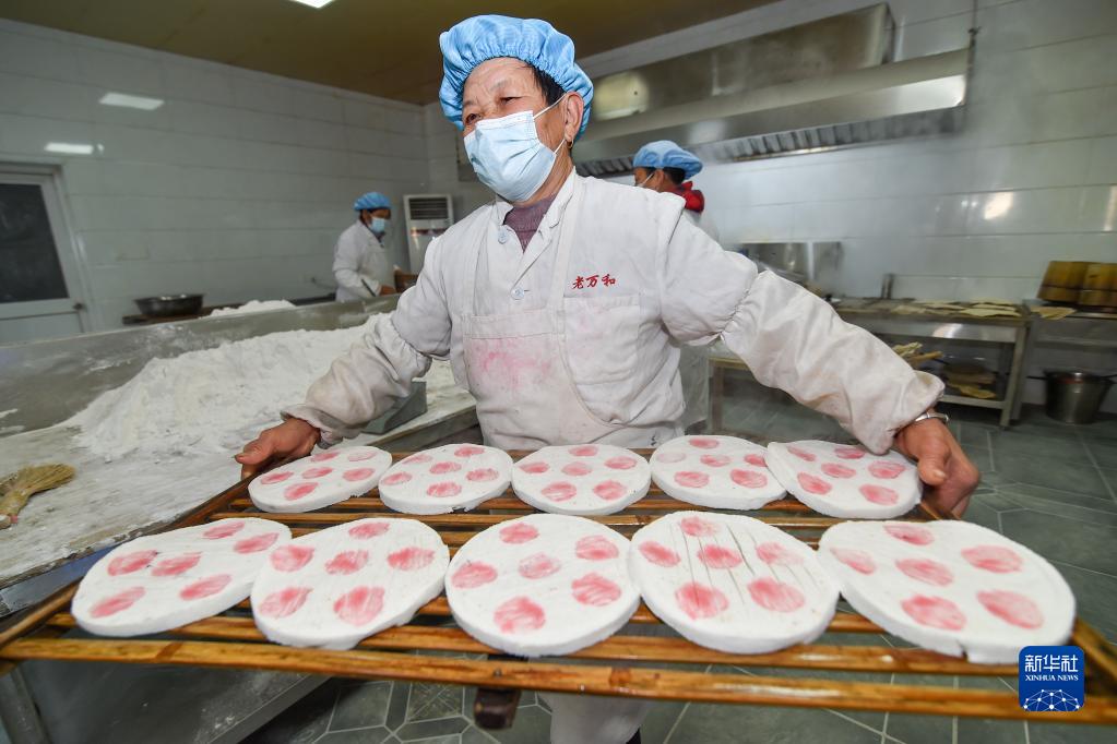 1月17日,在江蘇省南通市如皋市老萬(wàn)和潮糕店,工作人員在運送林梓潮糕。林梓潮糕是當地傳統點(diǎn)心,由糯米、粳米加工成米粉,拌上白糖、桂花等制成糕坯,再經(jīng)多道工序蒸制而成。
