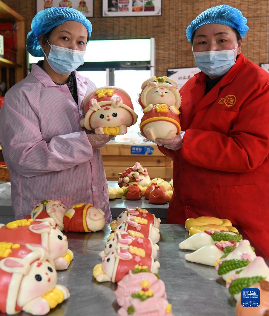 1月19日,在河南省濟源市北海街道一處面點(diǎn)作坊,工作人員展示蒸制好的“萌兔”花饃。