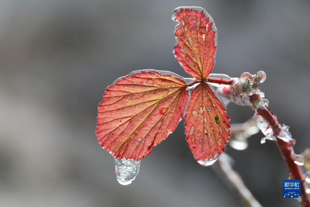云南騰沖市馬站鄉響水溝山谷里,葉片上凝結了晶瑩透亮的冰(1月14日攝)。