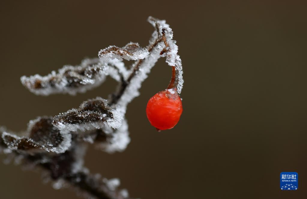 貴州省黔東南苗族侗族自治州丹寨縣龍泉山,野果被冰花覆蓋(1月15日攝)。