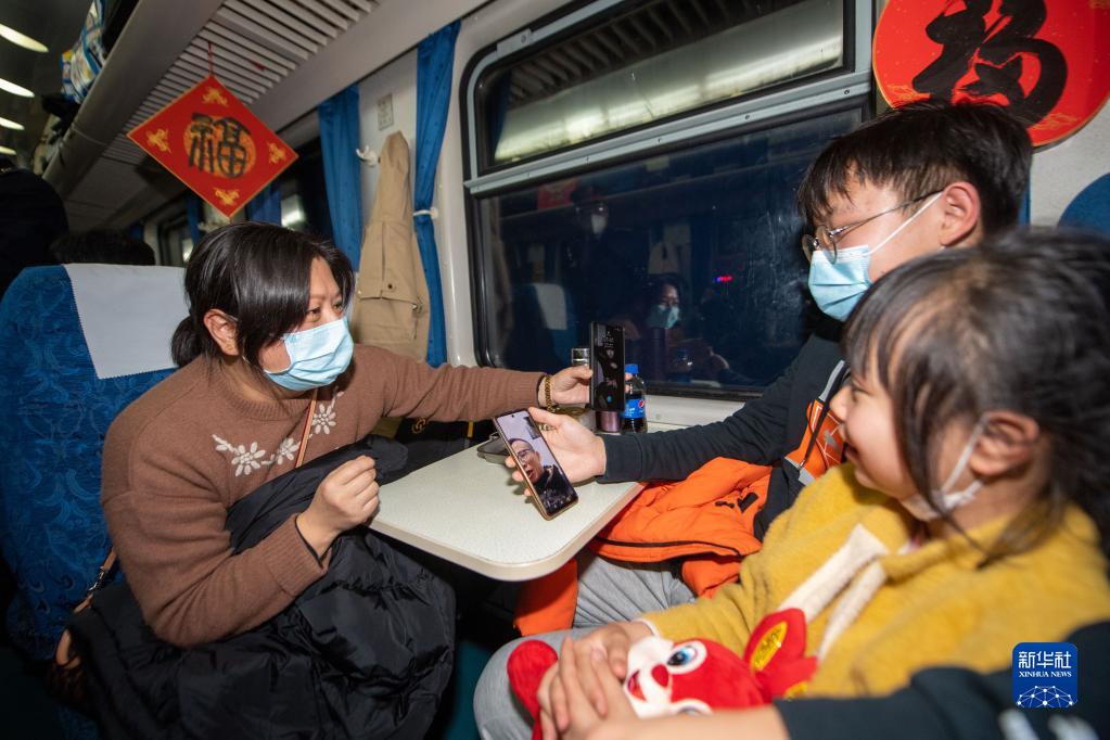 1月18日,回廣東韶關(guān)老家過(guò)年的旅客卜慧芬(左)在K209次列車(chē)上和兒子女兒一起與留守浙江的丈夫視頻通話(huà)。