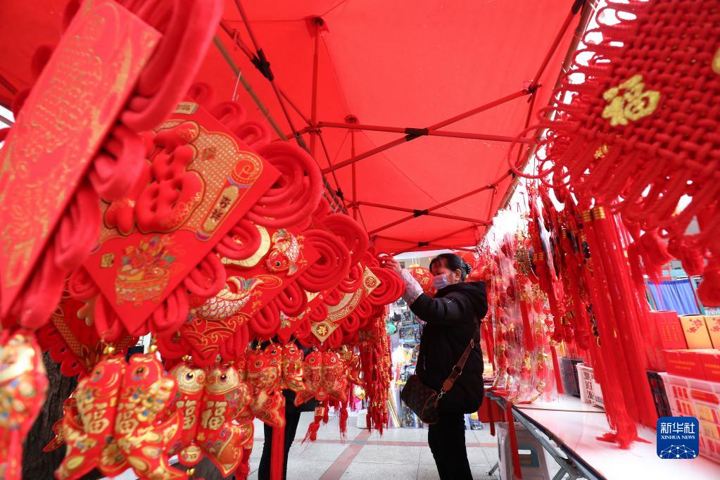 1月19日,市民在湖南省資興市一家年貨市場(chǎng)選購春節飾品。