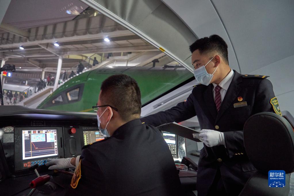 1月17日,在成都南站,擔任副司機的沙馬伍且(右)在D871次復興號機車(chē)駕駛室輔助司機進(jìn)行開(kāi)車(chē)前各項準備。