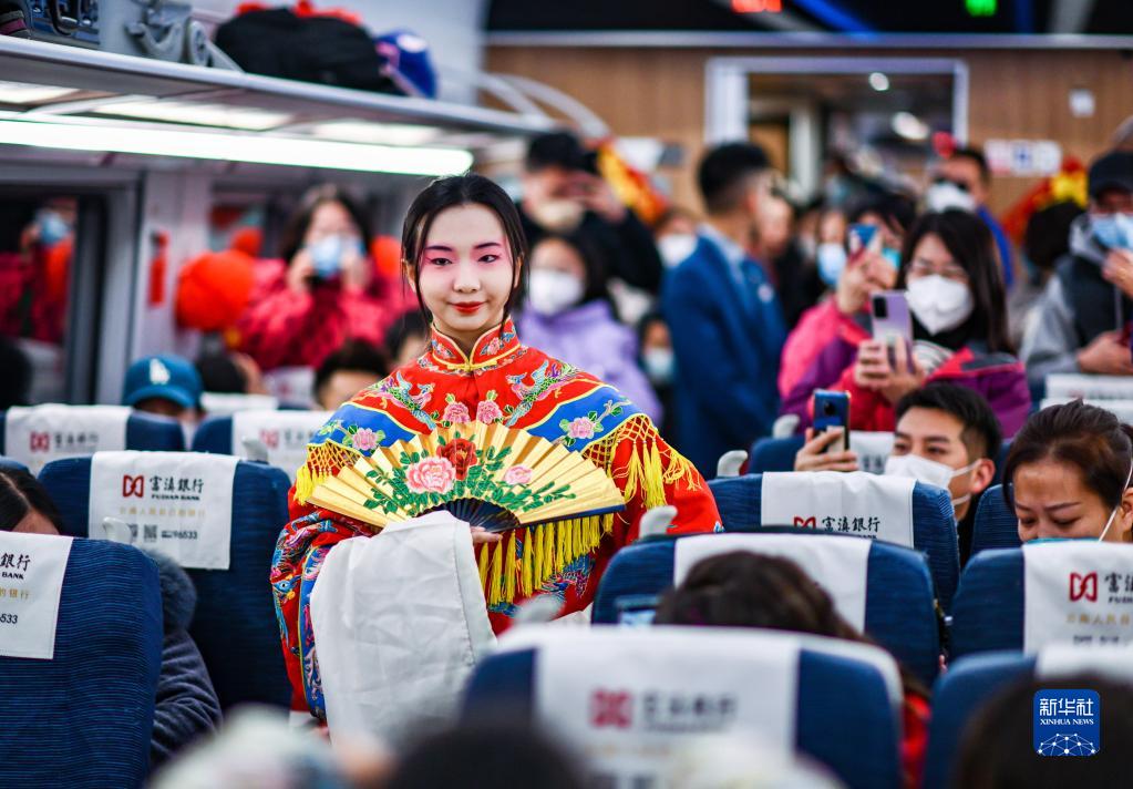 當日,奔馳在中老鐵路上的C272次列車(chē)車(chē)廂內,一場(chǎng)以“中老一家親,祥和中國年”為主題的列車(chē)春晚精彩上演。