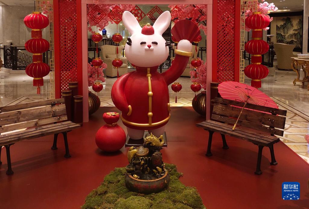 這是1月17日在土耳其最大城市伊斯坦布爾一家酒店大廳拍攝的兔年裝飾。