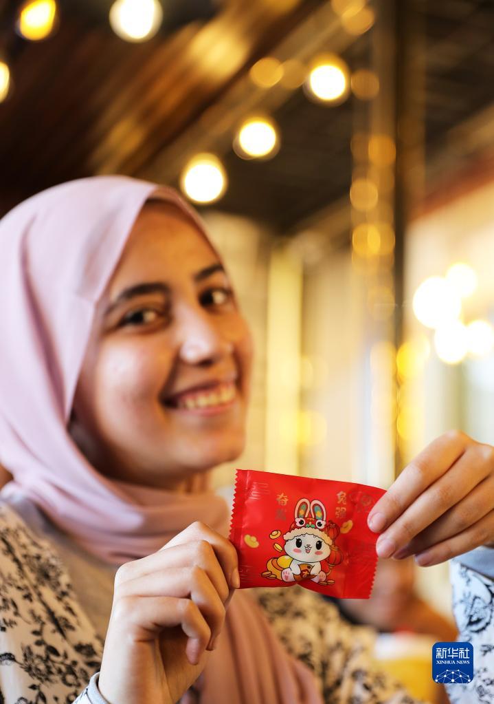 1月18日,一位顧客在位于埃及首都開(kāi)羅的一家烘焙坊內感受中國春節氛圍。臨近中國農歷春節,這家烘焙坊推出兔年春節主題裝飾與商品,增添節日氣氛、吸引消費者。