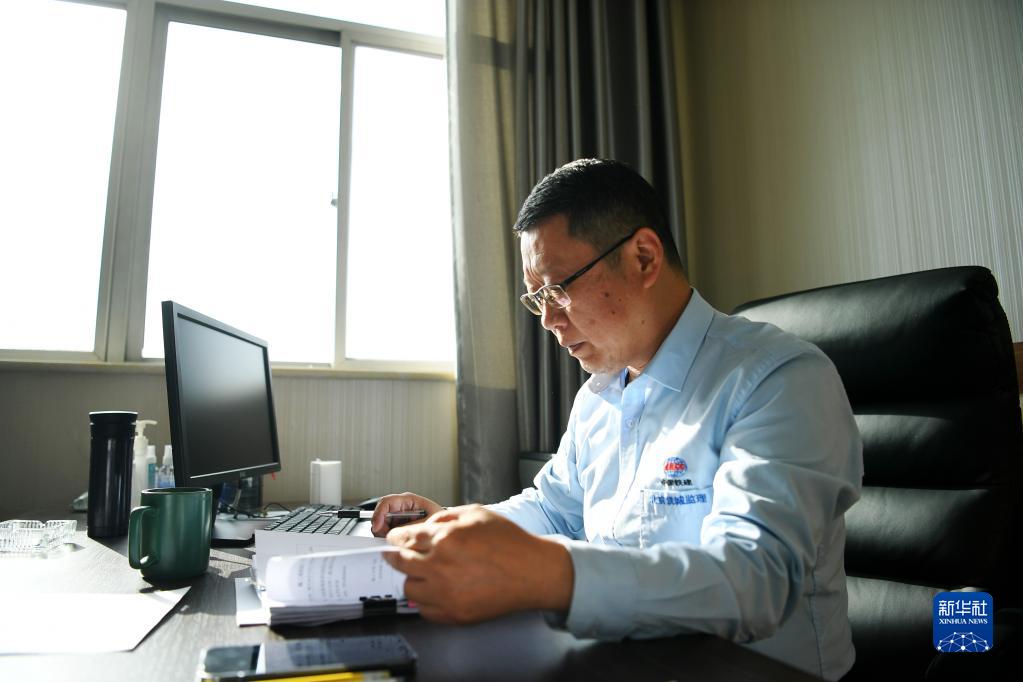 梅東冬在雄安新區至北京大興國際機場(chǎng)快線(xiàn)(R1線(xiàn))一標段項目部辦公室工作(1月18日攝)。