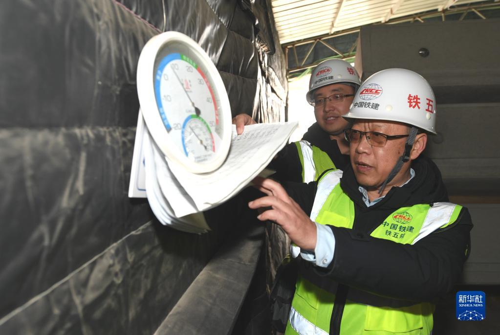 梅東冬(前)在雄安新區至北京大興國際機場(chǎng)快線(xiàn)(R1線(xiàn))一標段項目工地巡查(1月18日攝)。