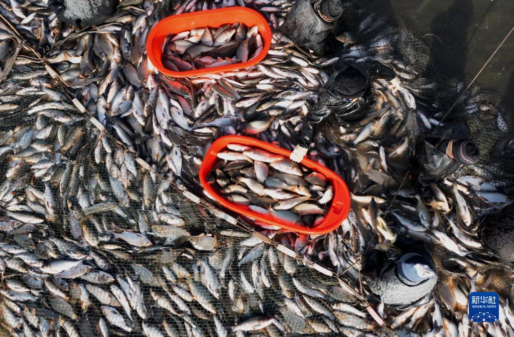 1月20日,唐山市豐南區老鋪村的村民在魚(yú)塘捕撈淡水魚(yú)(無(wú)人機照片)。