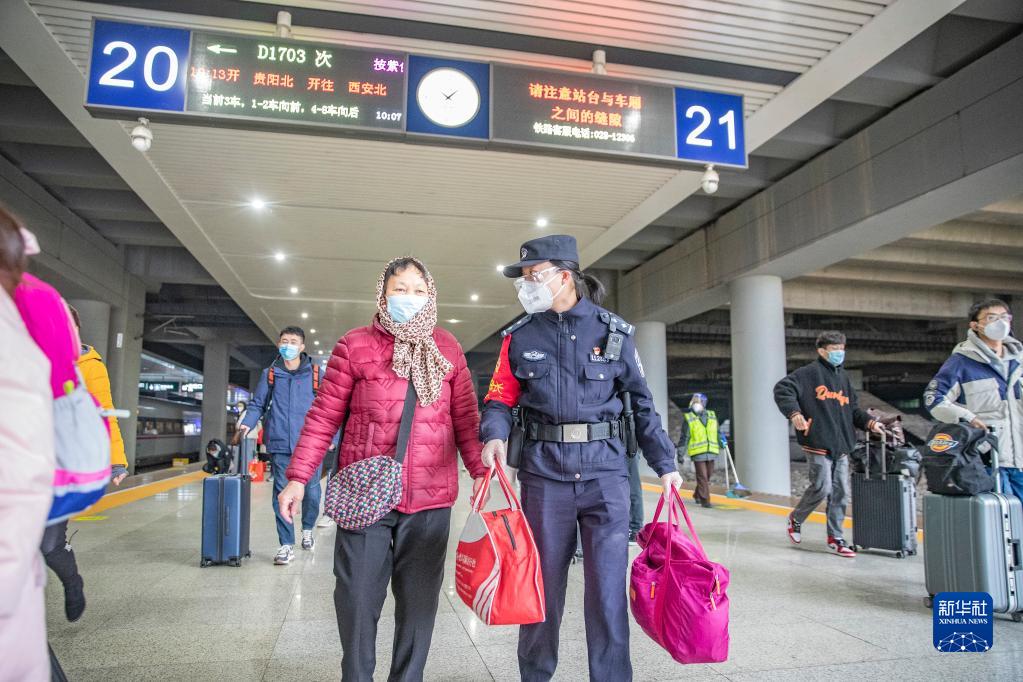 1月16日,在重慶西站列車(chē)站臺,重慶鐵路公安處乘警支隊“芳華”女子乘務(wù)警組的朱小麗帶領(lǐng)旅客前往候車(chē)位置。