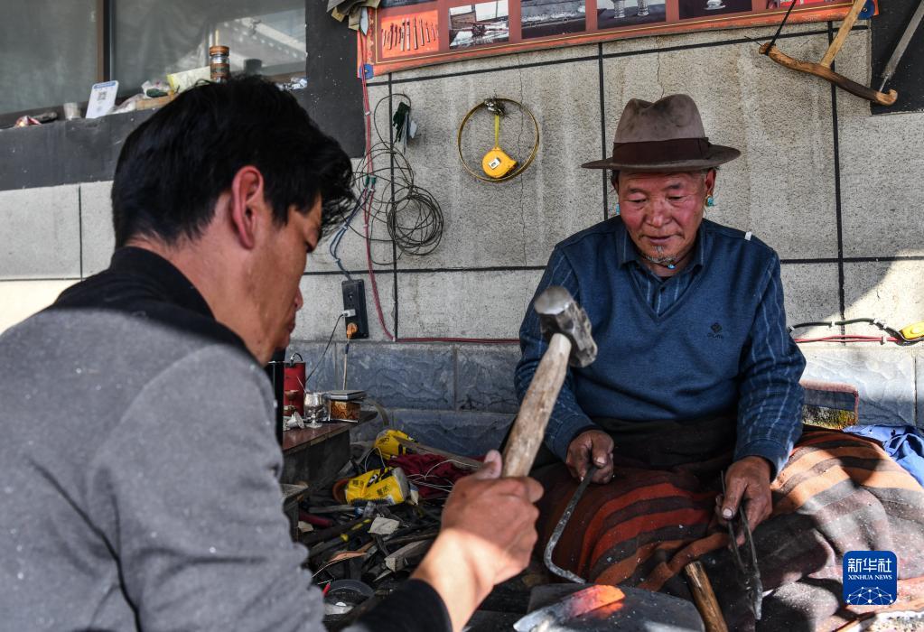 普達瓦(右)和兒子多吉占堆一起制作拉孜藏刀(1月19日攝)。