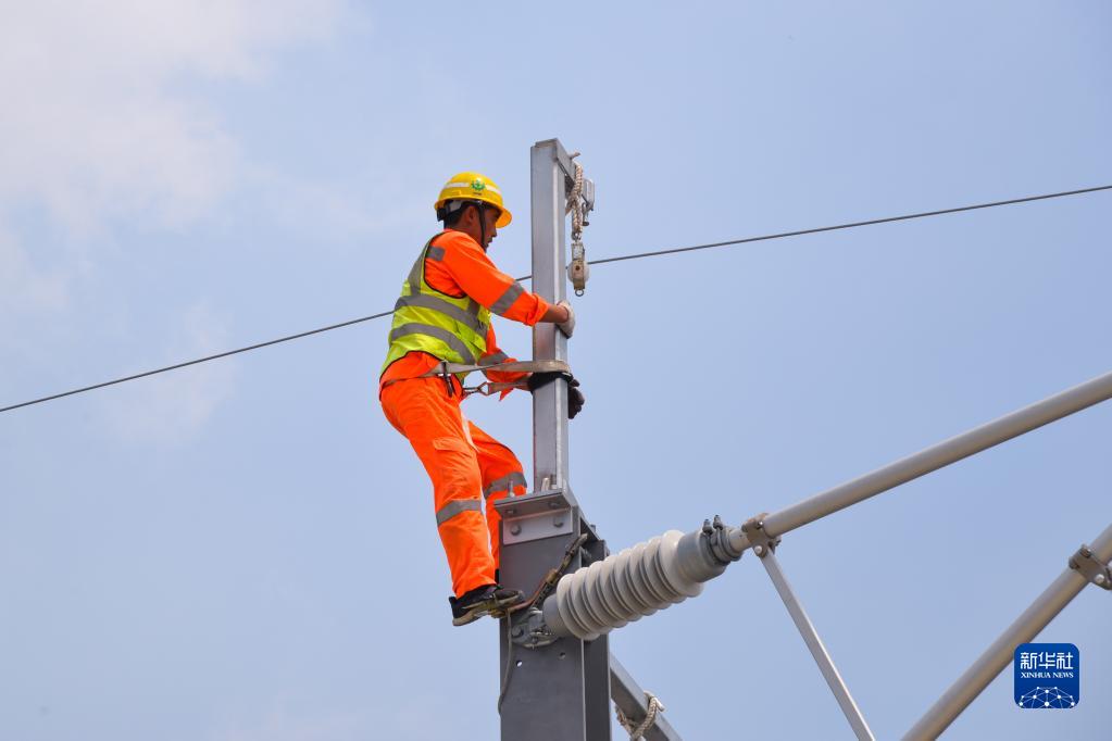 1月21日,在印度尼西亞勿加泗雅萬(wàn)高鐵沿線(xiàn),中鐵電氣化局印尼雅萬(wàn)高鐵項目部施工人員進(jìn)行高鐵接觸網(wǎng)附加線(xiàn)架設工作。