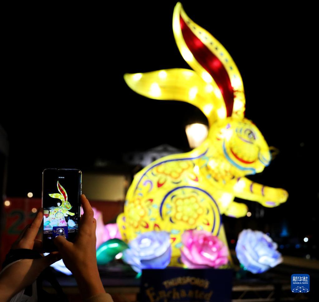 1月21日晚,游客在英國倫敦特拉法加廣場(chǎng)拍攝兔子彩燈。