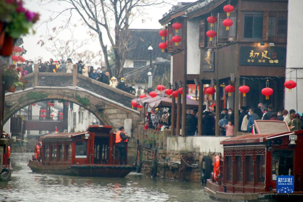 1月22日,游客在江蘇省蘇州市山塘古街游覽。