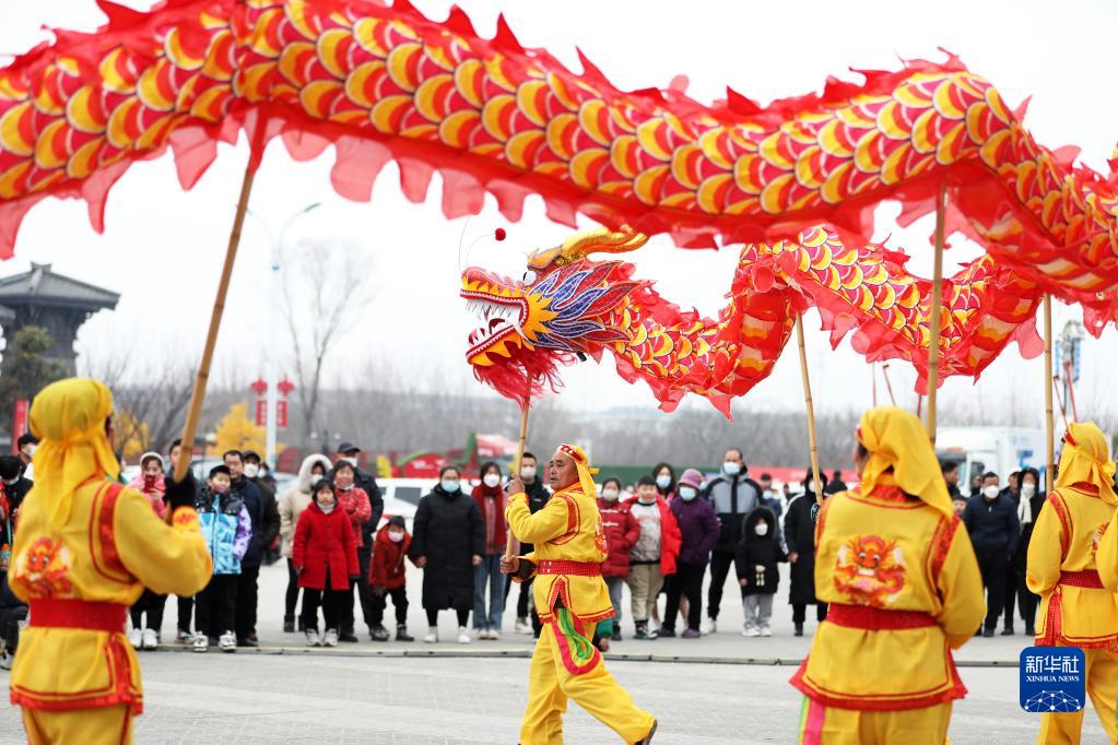 1月22日,在山東省臨沂市郯城縣郯國古城景區,民俗表演隊伍表演舞龍。
