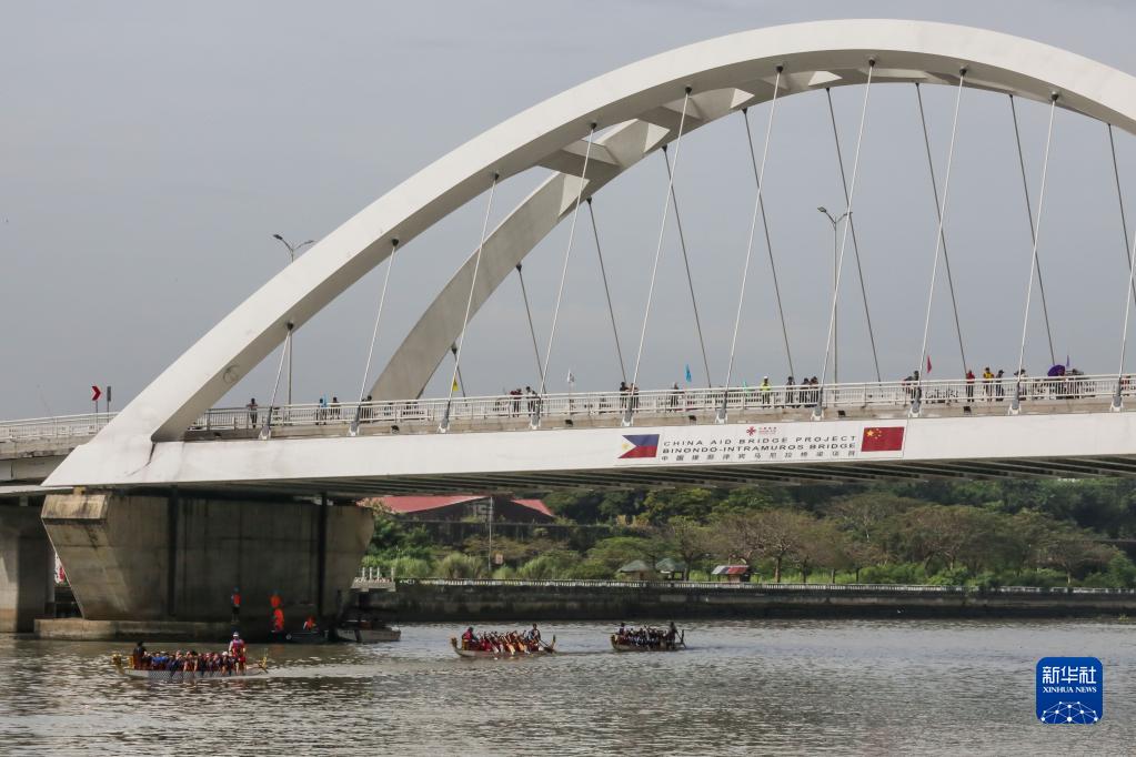 1月22日,在菲律賓馬尼拉,參加龍舟賽的船只通過(guò)中國政府援建菲律賓比農多-王城跨河公路橋。