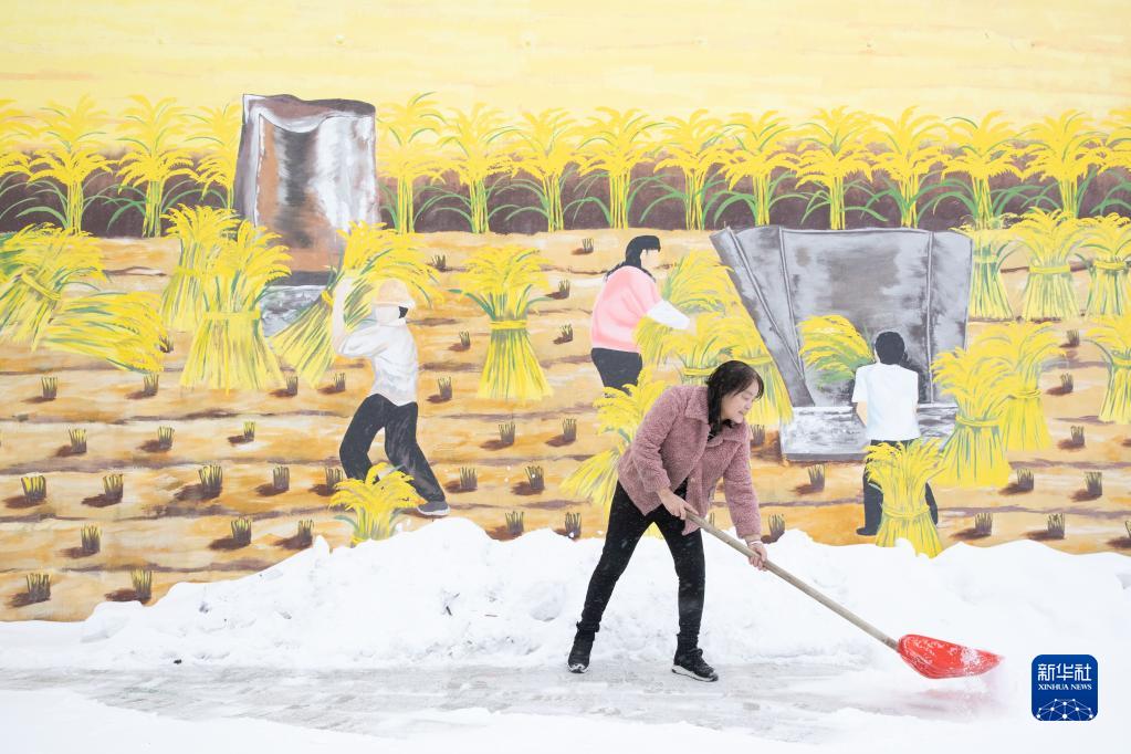 1月12日,在黑龍江省漠河市北紅村“遠方故里”民宿,負責人張翠花在清理積雪。
