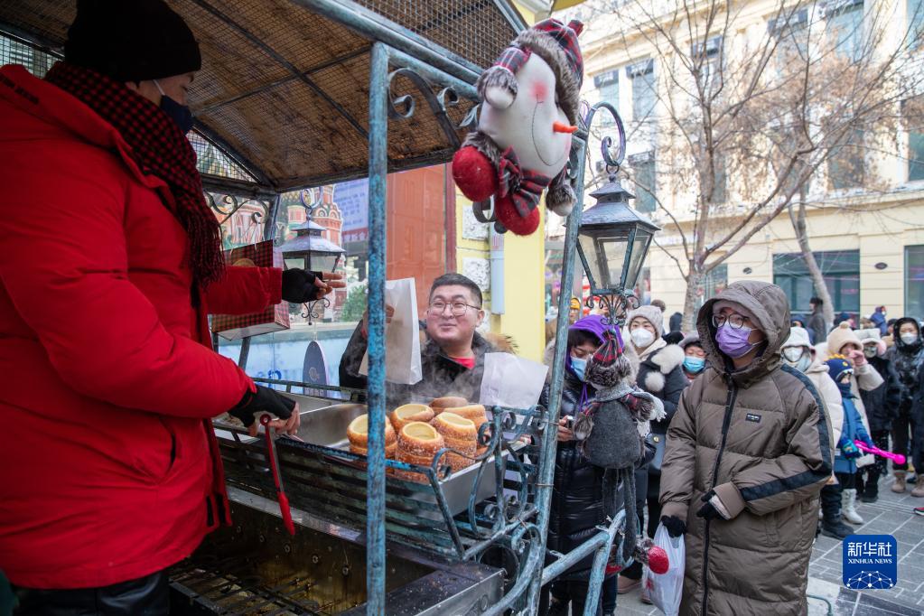 1月22日,游客在哈爾濱道里區中央大街排隊購買(mǎi)面包。