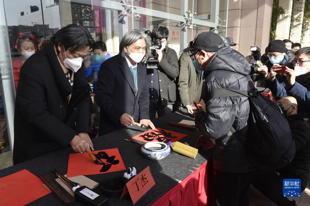 1月22日,中國美術(shù)館館長(cháng)吳為山(左二)為觀(guān)眾現場(chǎng)書(shū)寫(xiě)并贈送“?!弊?。