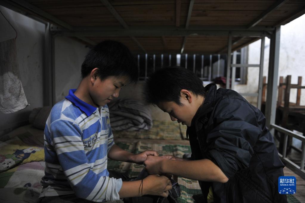 在弄勇小學(xué)學(xué)生宿舍,蒙宣任(左)在縫衣服(2014年5月3日攝)。
